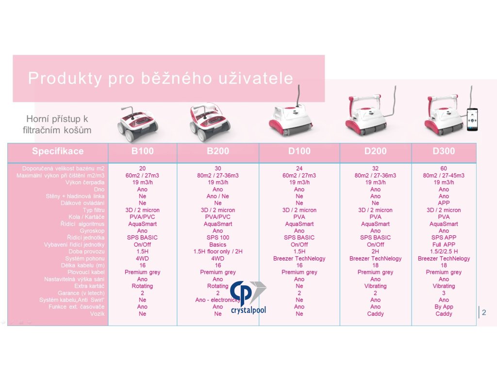 - Model D300 má navíc vestavěný modul s Bluetooth!: Ovládání robotického vysavače je možné přes aplikaci BWT Best Water Home, kterou si můžete zdarma stáhnout z App Store nebo Play Store. Ideální pro zaměření robota na problémové oblasti. Můžete robotem pohybovat, kam se vám zlíbí a sbírat nečistoty nebo malé předměty, které Vaše děti hodily do bazénu. Váš bazén bude čistý okamžitě s minimálním úsilím.