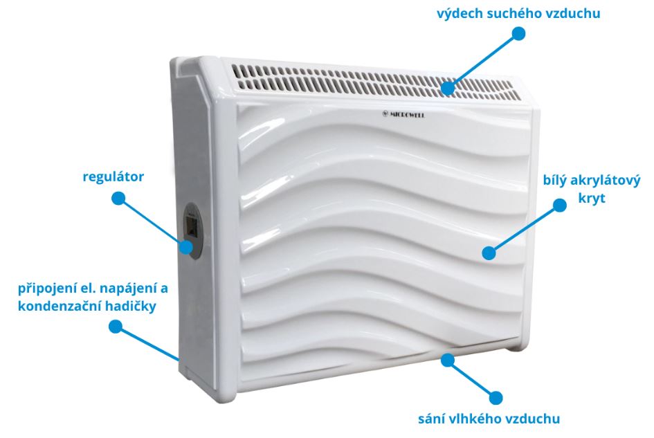 Odvlhčovač MICROWELL DRY WAVE je určen pro provoz v náročných podmínkách bazénových hal, wellness, průmyslových prostor nebo sušáren. Robustní kovový plášť s bílou povrchovou, pozinkované části a výměníky s ochranou GoldFin zaručují odolnost proti chlóru i slané vodě. Konstrukce je přizpůsobena jak pro postavení na zem.
