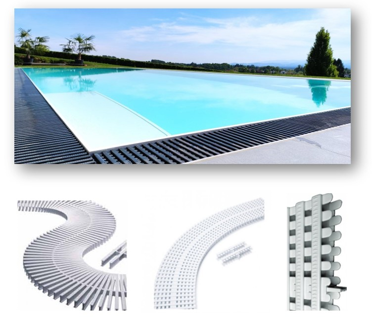 Přeliv může být instalován okolo celého bazénu či pouze na jedné straně tzv. jednostranný přeliv.