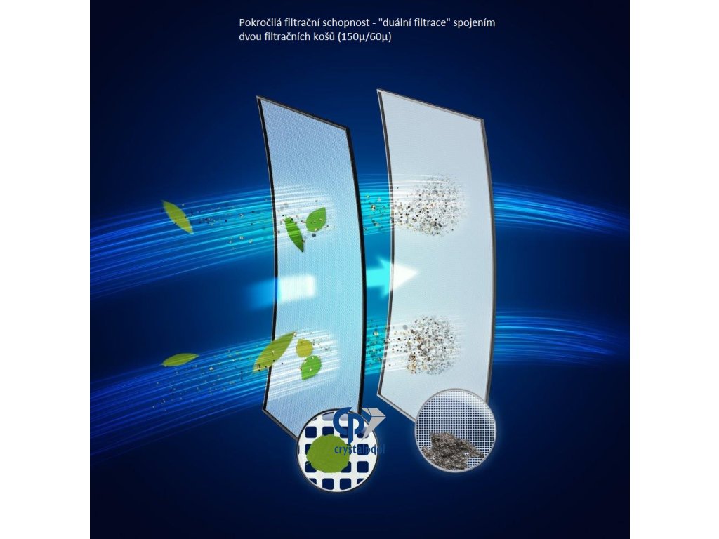 - Dvojitá filtrace = dokonalá čistota – Duální koš (150 μ / 60 μ) zachytí i nejjemnější nečistoty, od listí po pyl a jemný prach.