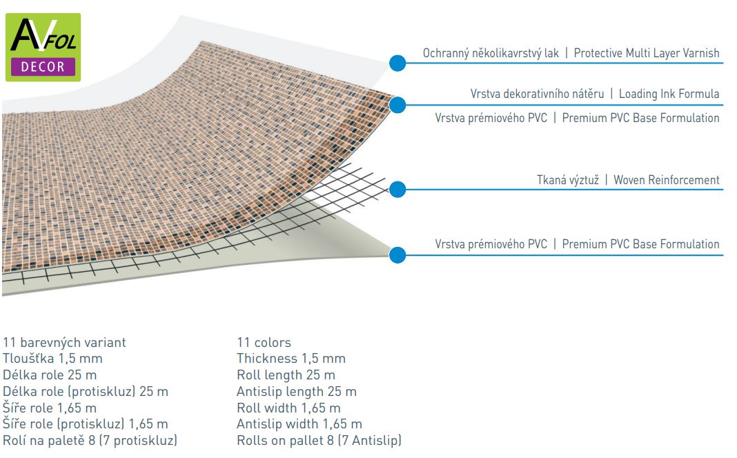 Protiskluzová fólie AVfol Decor Electric v šíři 1,65 m, tloušťce 1,5 mm a délce 20 m. Bezpečné a stylové řešení pro schody a vstupy s odvážným mozaikovým designem.