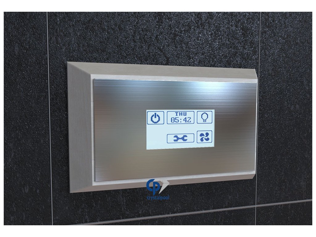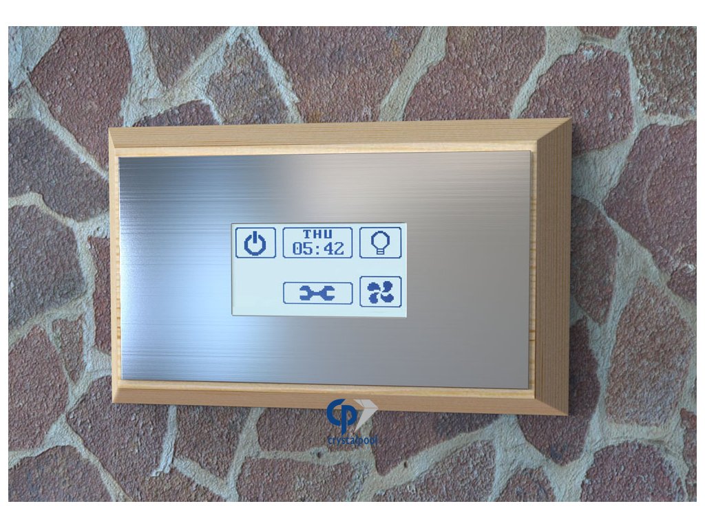 Dotykový ovládací panel pro parní generátory Sentiotec s digitálním zobrazením času a teploty. Programovatelná doba a teplota relace, zapnutí a vypnutí, pohotovostní a jednoduchý režim, automatický nebo ruční spínač světel v sauně, programovatelný týdenní časovač s maximálně třemi programy denně.
