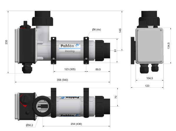Ohřívač je dodáván s nastavitelným termostatem s teplotním rozsahem 0-45°C, ochranou proti přehřátí s max. teplotou 60° C a průtokovým spínačem, který přeruší napětí, když je průtok vody menší než 90 l/min. Plášť je vyroben z vyztuženého termoplastu, krátký (3, 6, 9 kW) nebo dlouhý (12, 15, 18 kW). Ohřívač je k dispozici ve dvou různých verzích: Incoloy 825 nebo s titanovou patronou. Titan se používá do agresivní vody, slané vody nebo v bazénech s chlórovým strojem/chlorátorem soli. Přípojky jsou vyrobeny z PVC pro vnitřní uchycení na PVC trubky Ø50 mm.