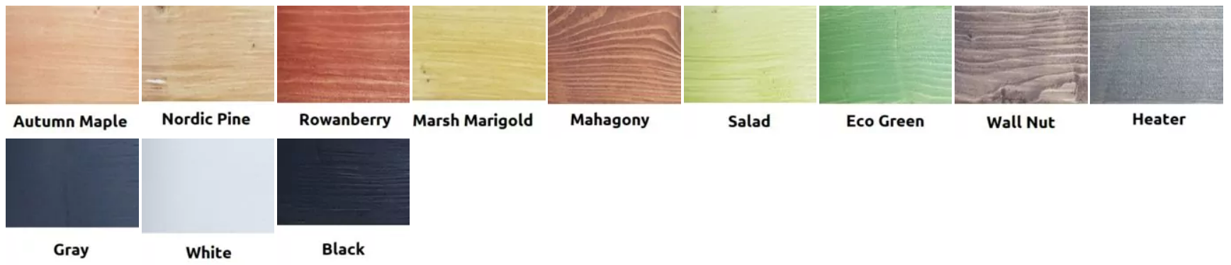 V případě, že si k sauně objednáte montáž, nabízíme Vám také široké množství barevných nátěrů. Pokud byste měli zájem o nabarvení sauny, do poznámky v objednávce k montáži uveďte i název nátěru (barevný nátěr není součásti ceny montáže a účtuje se zvlášť).