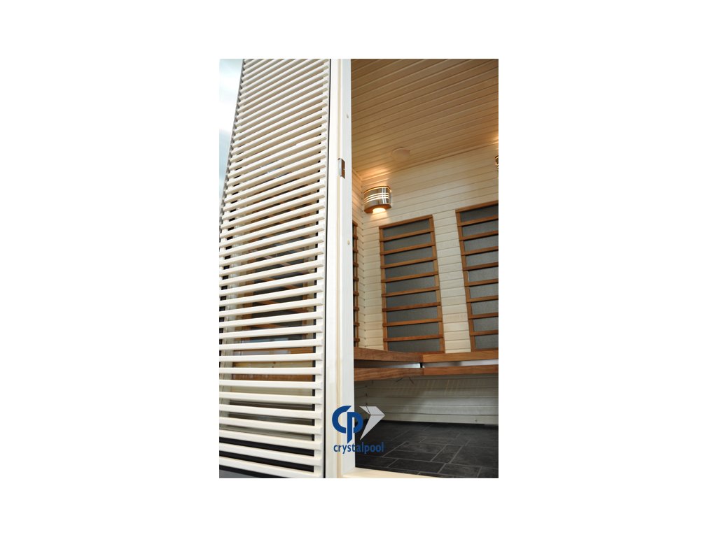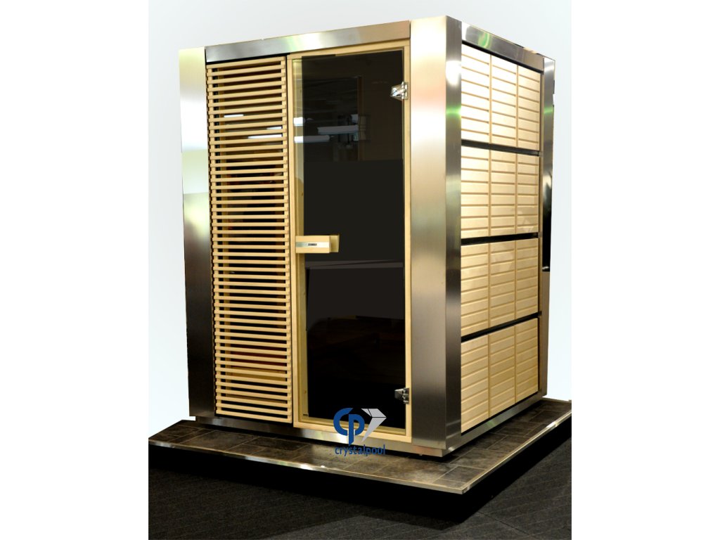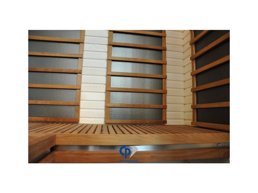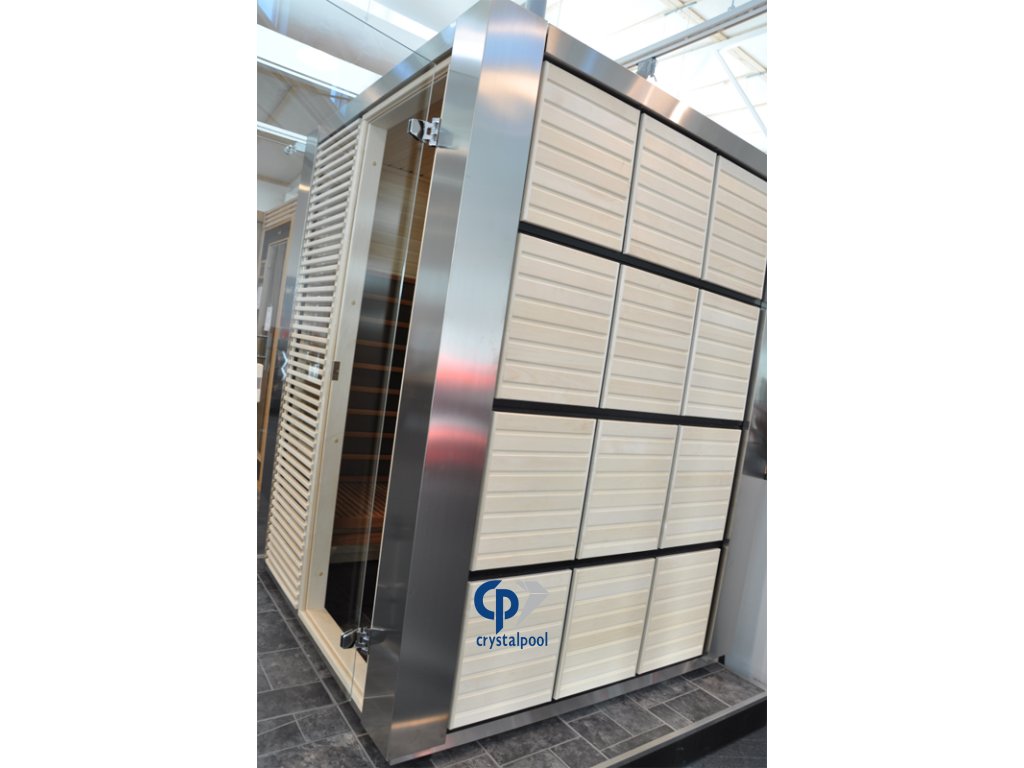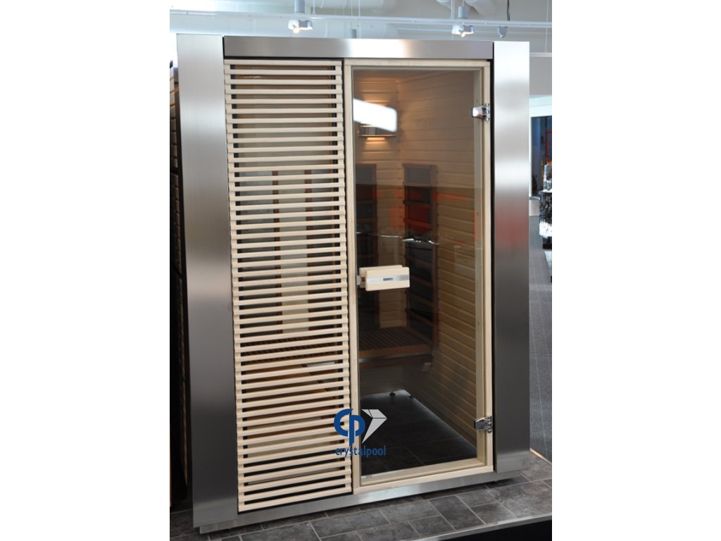 Infrasauna je dekorována nerezovými prvky. Dekorativní nerezové prvky dotváří moderní vzhled tohoto modelu. Zákazník má na výběr z několika dřevěných materiálů - osika, olše, THERMOWOOD. Sauna je vybavena, digitální jednotkou Griffin infra.