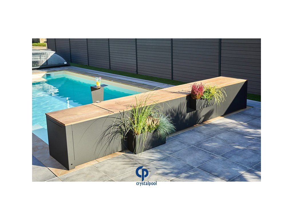 BANC D.Sign představuje prémiové nadhladinové lamelové zakrytí bazénu s originálním designem, kde je návin hřídele inteligentně ukryt v elegantní lavici. Ta slouží nejen jako technický prvek, ale také jako plnohodnotný zahradní mobiliář pro odpočinek přímo u bazénu.