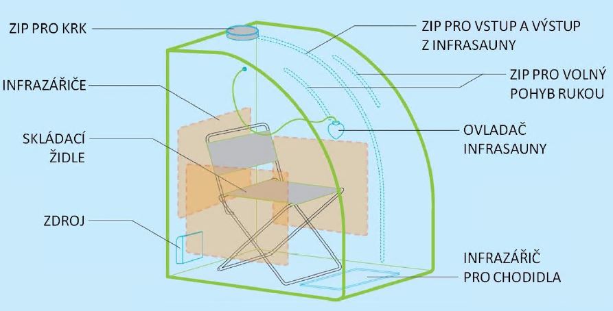 Mobilní infrasauna s podpěrnou konstrukcí v sobě zahrnuje výhody klasické infrasauny v přenosném provedení. Stan je vyroben z prošívané textílie. Tato přenosná infračervená sauna je vybavena karbonovými infrazářiči o výkonu 630W a infrazářičem pro chodidla. Balení obsahuje digitální ovladač s nastavením času a teploty.