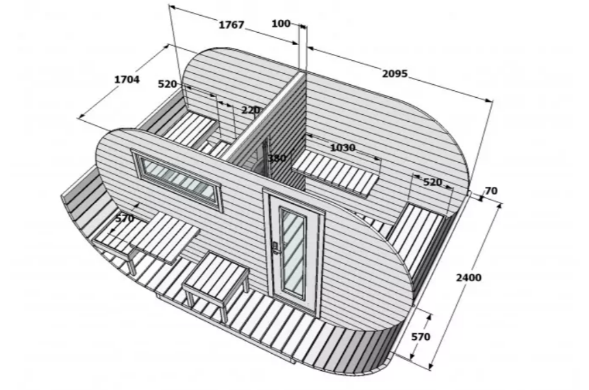 - Je vhodný pro venkovní umístění a svým designem a elegancí doplní krásný vzhled Vaší zahrady. Disponuje dveřmi s okýnkem, tudíž se v průběhu saunování můžete kochat okolní přírodou. Před vstupem do vnitřního prostoru sauny se nachází zastřešená veranda s posezením, kterou je možné využít pro ochlazení po vydatném saunování nebo zde strávit čas na čerstvém vzduchu. Pro zajištění pohodlí jsou uvnitř sauny dvě lavice. Součástí je i sezení v předsíňce.