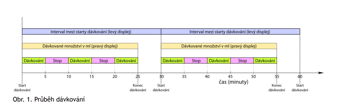 Čerpadlo je opatřeno dvěma LED-displeji. Na horním je zobrazena perioda mezi starty dávkování, na dolním množství v ml, dávkované v jedné periodě. Toto dávkované množství je v průběhu dávkovací periody rozděleno tak, že střídavě probíhá 5 minut dávkování a 5 minut přestávka. Nastavení periody dávkování a dávkovaného množství se provádí tlačítka + a – pod displeji.