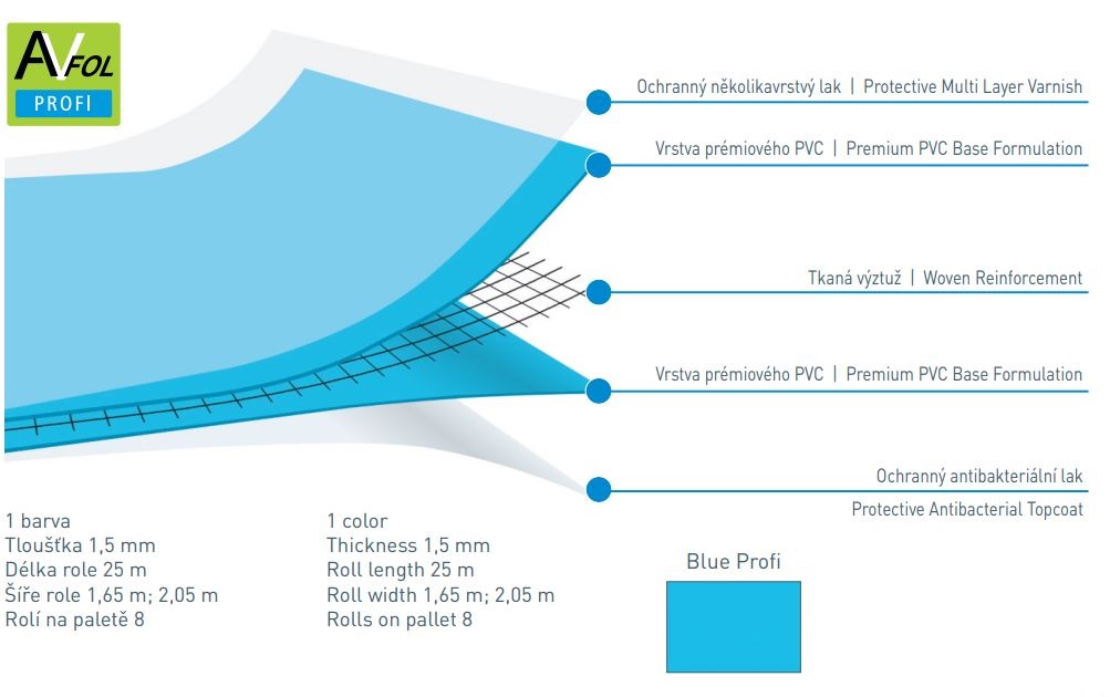 Vyztužená fólie s antibakteriálním lakem z obou stran – ideální pro veřejné bazény. Klasická modrá barva, prodává se na metráž.
