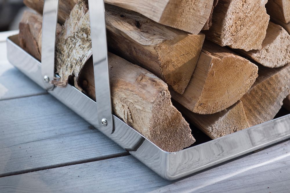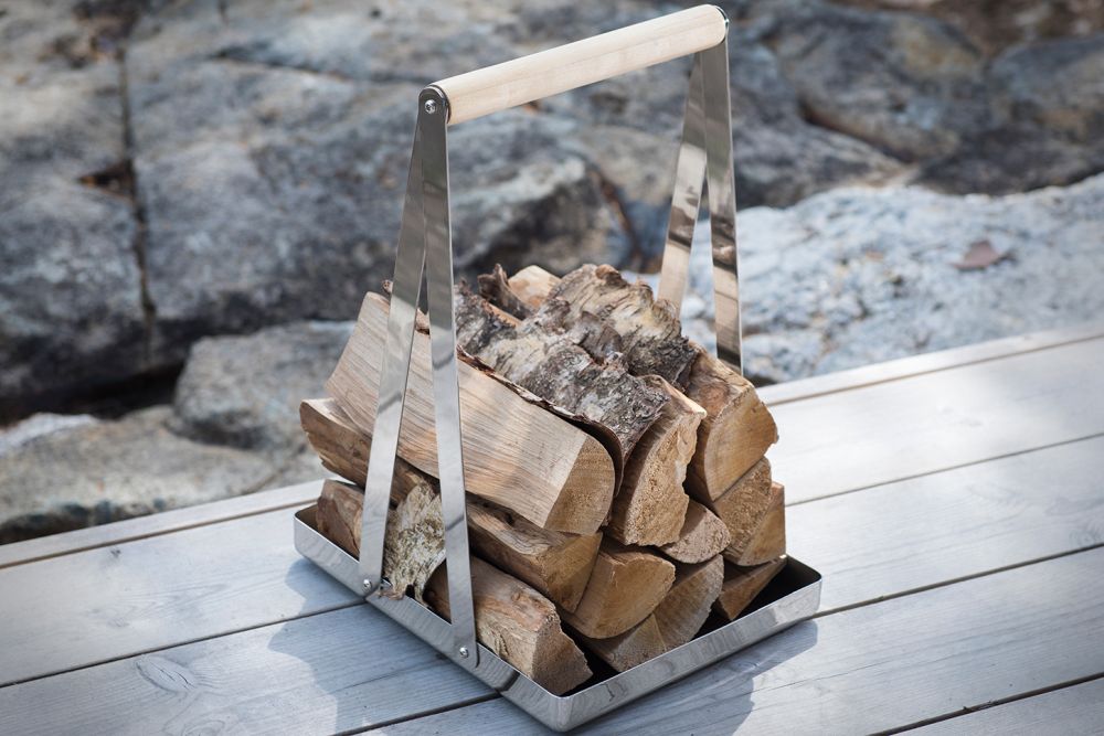 Navrhl Harri Koskinen. Stojan na palivové dříví je vyroben z nerezové oceli, rukojeť z břízy. Krásný a čistý skandinávský design.