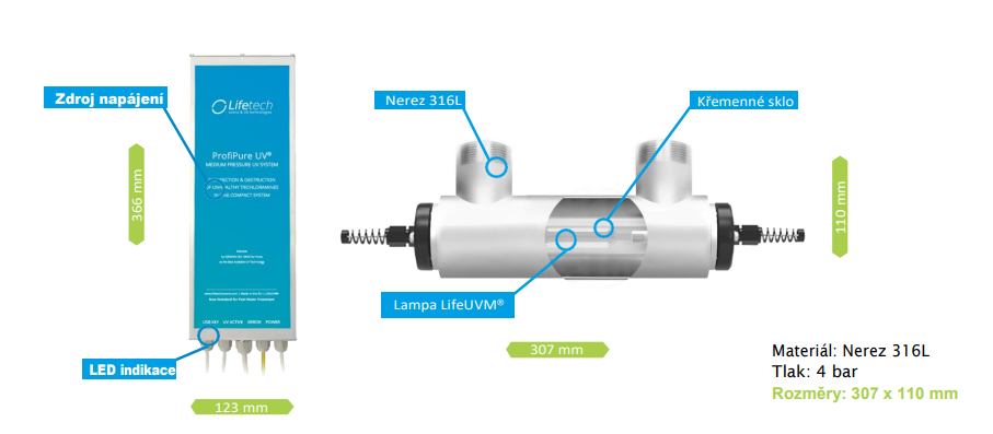 - Předpokládaná životnost UV výbojky: 5 000 hod