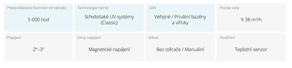 | Předpokládaná životnost UV výbojky | 5 000 hod |