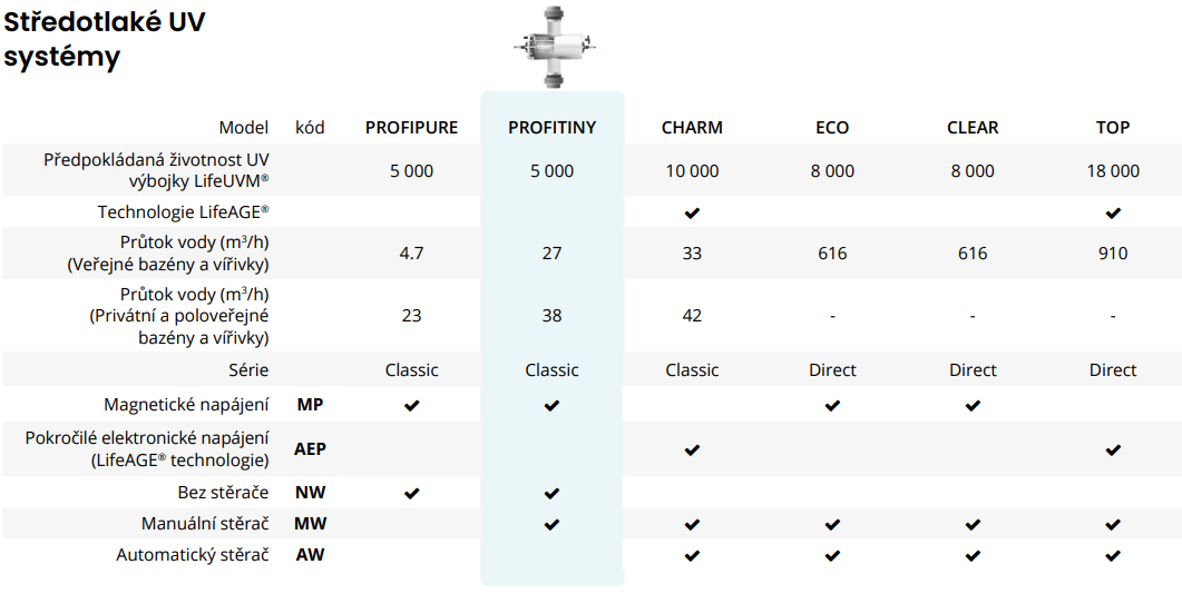 ProfiTiny využívá UVM technologii, která je vhodná pro zdravé čištění vody v domácích i komerčních bazénech a vířivkách do 290 m³. Lze ji napojit i na vaši stávající technologii bazénu -snadná instalace i údržba.