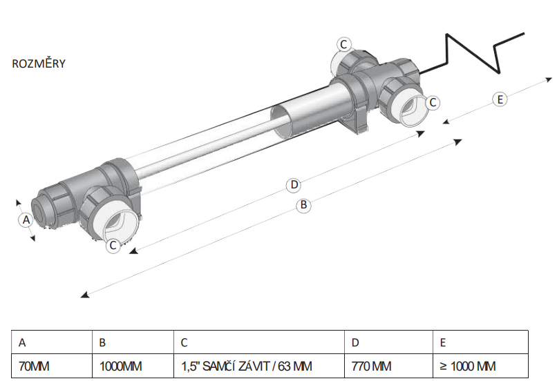 - Průměr 70 mm, délka 1 000 mm