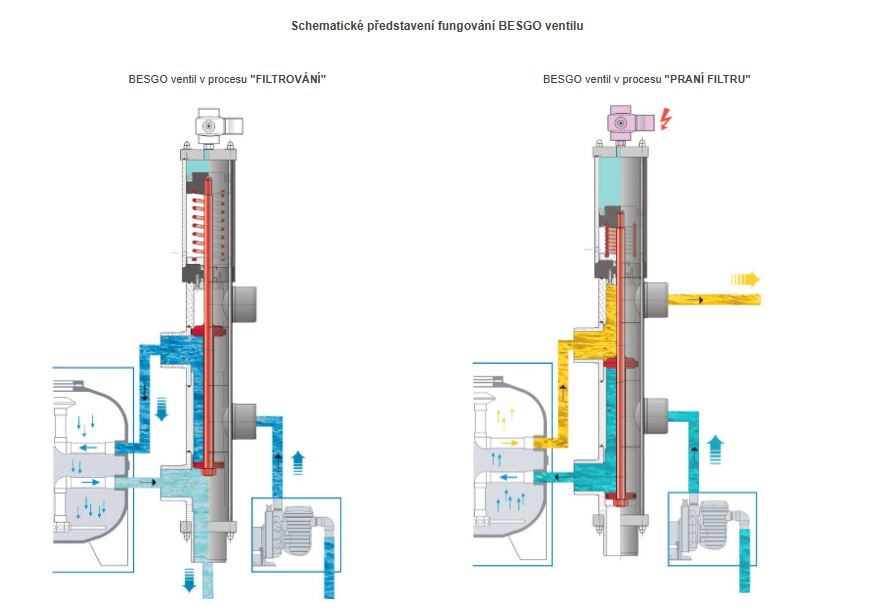✅ Automatické přepínání mezi režimy filtrace, proplachu, zavření a vypouštění.