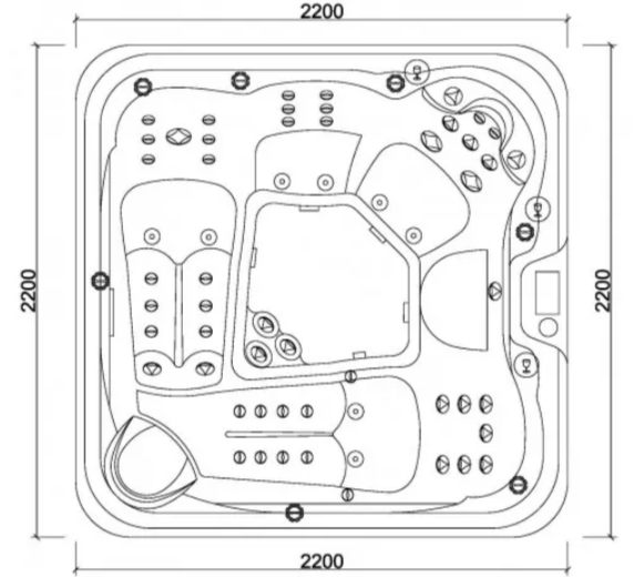 Vířivá vana disponuje 61 masážními tryskami, z toho 53 je hydromasážních, 8 vzduchových trysek.